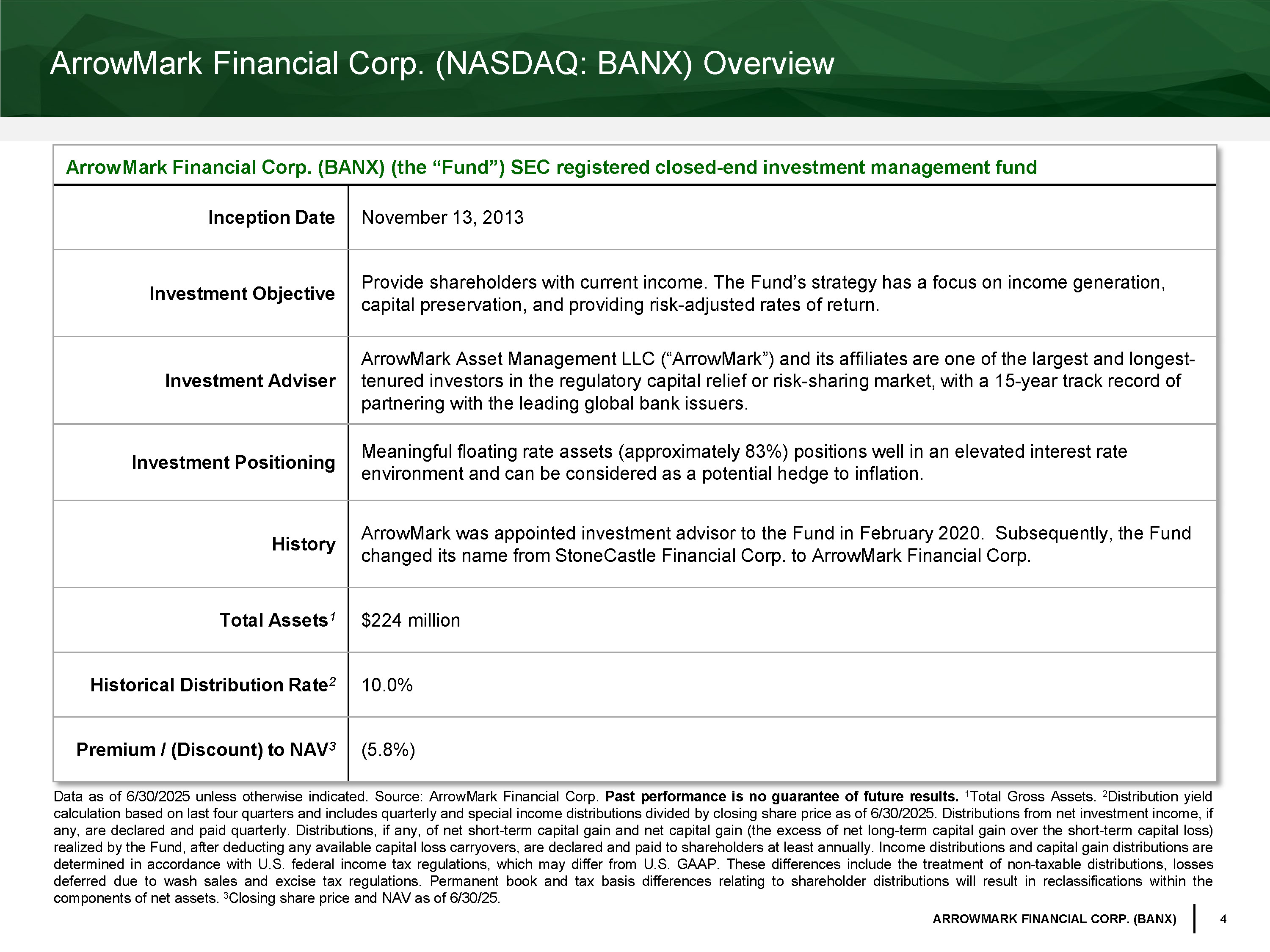 4 ARROWMARK FINANCIAL CORP. (BANX) ArrowMark Financial Corp. (NASDAQ: BANX) Overview ArrowMark Financial Corp. (BANX) (the “Fund”) SEC registered closed - end investment management fund Inception Date November 13, 2013 Investment Objective Provide shareholders with current income. The Fund’s strategy has a focus on income generation, capital preservation, and providing risk - adjusted rates of return. Investment Adviser ArrowMark Asset Management LLC (“ ArrowMark ”) and its affiliates are one of the largest and longest - tenured investors in the regulatory capital relief or risk - sharing market, with a 15 - year track record of partnering with the leading global bank issuers. Investment Positioning Meaningful floating rate assets (approximately 83%) positions well in an elevated interest rate environment and can be considered as a potential hedge to inflation. History ArrowMark was appointed investment advisor to the Fund in February 2020. Subsequently, the Fund changed its name from StoneCastle Financial Corp. to ArrowMark Financial Corp. Total Assets 1 $224 million Historical Distribution Rate 2 10.0% Premium / (Discount) to NAV 3 ( 5.8 %) Data as of 6 / 30 / 2025 unless otherwise indicated . Source : ArrowMark Financial Corp . Past performance is no guarantee of future results . 1 Total Gross Assets . 2 Distribution yield calculation based on last four quarters and includes quarterly and special income distributions divided by closing share price as of 6 / 30 / 2025 . Di stributions from net investment income, if any, are declared and paid quarterly . Distributions, if any, of net short - term capital gain and net capital gain (the excess of net long - term capital gain over the short - term capital loss) realized by t he Fund, after deducting any available capital loss carryovers, are declared and paid to shareholders at least annually . Income distributions and capital gain distributions are determined in accordance with U . S . federal income tax regulations, which may differ from U . S . GAAP . These differences include the treatment of non - taxable distributions, losses deferred due to wash sales and excise tax regulations . Permanent book and tax basis differences relating to shareholder distributions will result in reclassifications within the components of net assets . 3 Closing share price and NAV as of 6 / 30 / 25 .