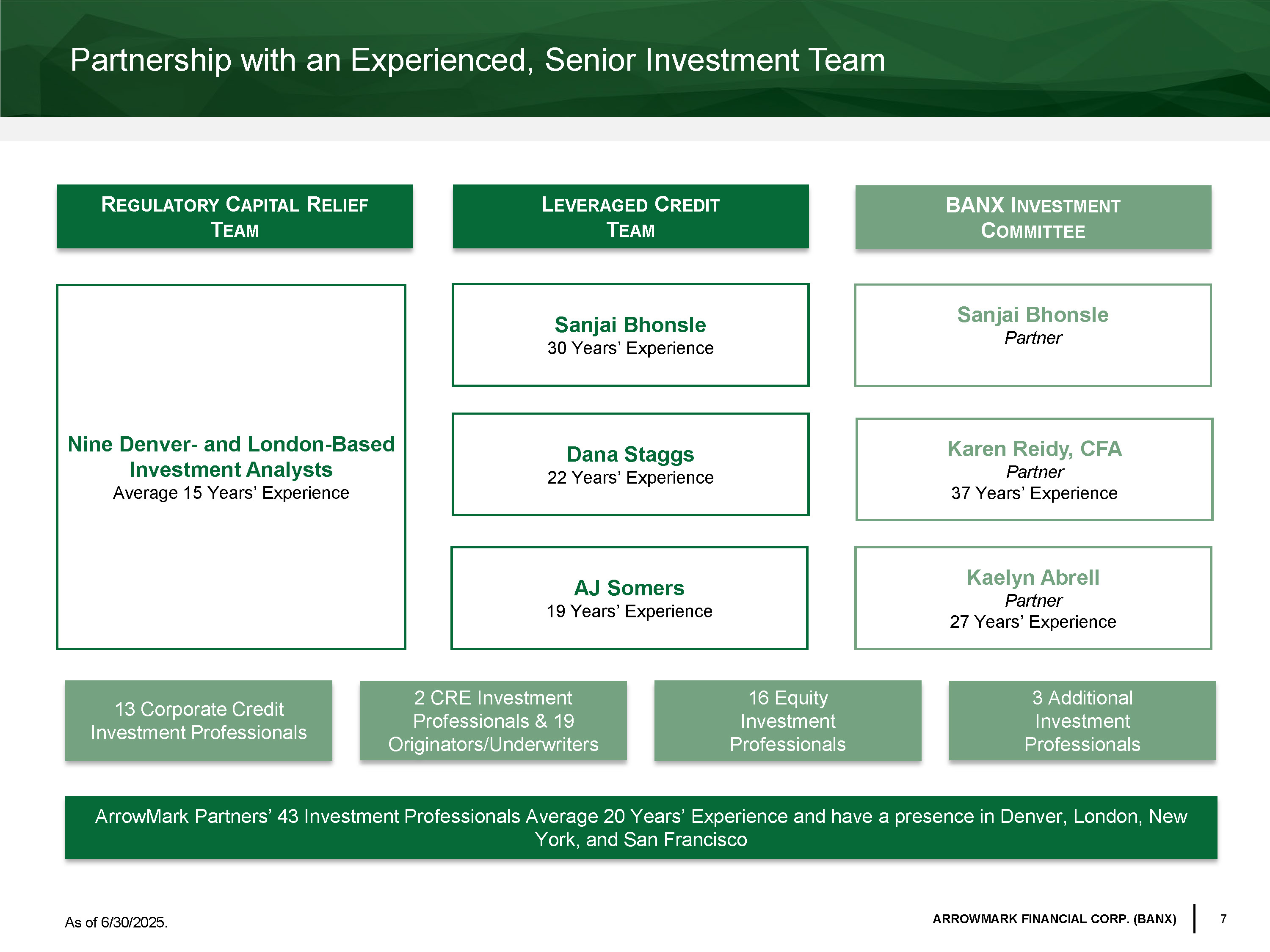 6 ARROWMARK FINANCIAL CORP. (BANX) Founded in 2007 by investment professionals with a proven track record of delivering strong returns and preserving client capital ArrowMark Partners has significant capabilities and expertise as a well - established investment manager As of 6 / 30 / 2025 . 1 CRE AUM includes real estate related assets originated and/or currently managed or advised by ArrowMark or its affiliate . Other includes sovereign wealth, not - for - profit institutions, union, multi - employer and internal capital . Firm level track record is available upon request . 2 Firm AUM breakdowns by asset type and investor type are e xpressed in billions . • Active investment process, driven by fundamental research and analysis • Specialized expertise in nuanced credit and inefficient equity markets • Manage alternative, traditional, and customized investment strategies in public and private vehicles • 103 employees • 43 tenured investment professionals • 100% employee - owned • Headquartered in Denver, CO with presence in California, London, and New York $18.5 billion in Assets Under Management 1 ArrowMark Partners At - A - Glance Credit & Multi - Asset , $2.9 Regulatory Capital Relief , $3.5 CLO Funds , $4.5 Equity , $5.1 Commercial Real Estate , $2.5 CLO Funds , $4.5 Corporate / Public , $3.4 Sub - Advisory , $2.7 Family Office / HNW , $3.2 Insurance , $2.5 Financial Intermediary , $1.3 Other , $0.9