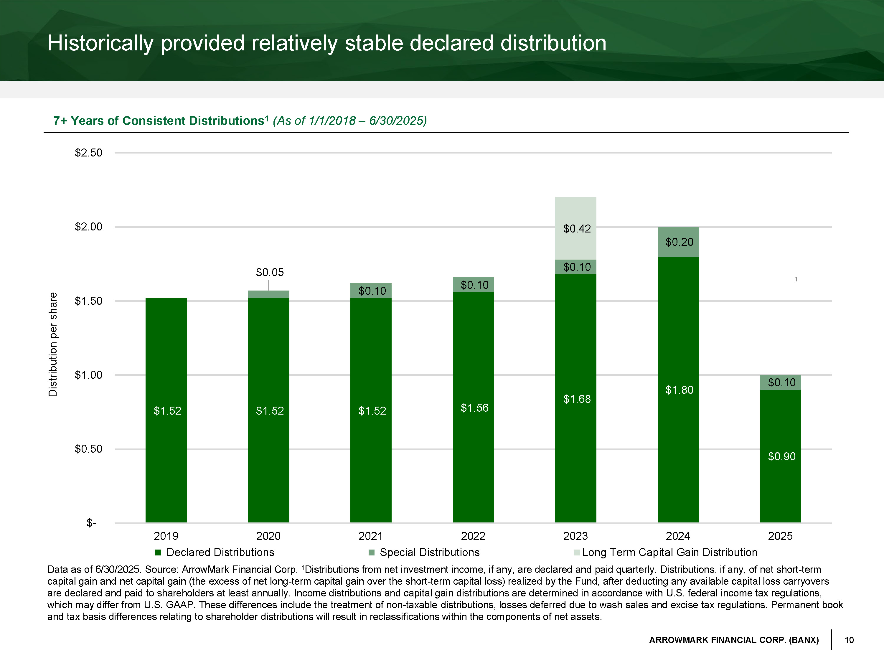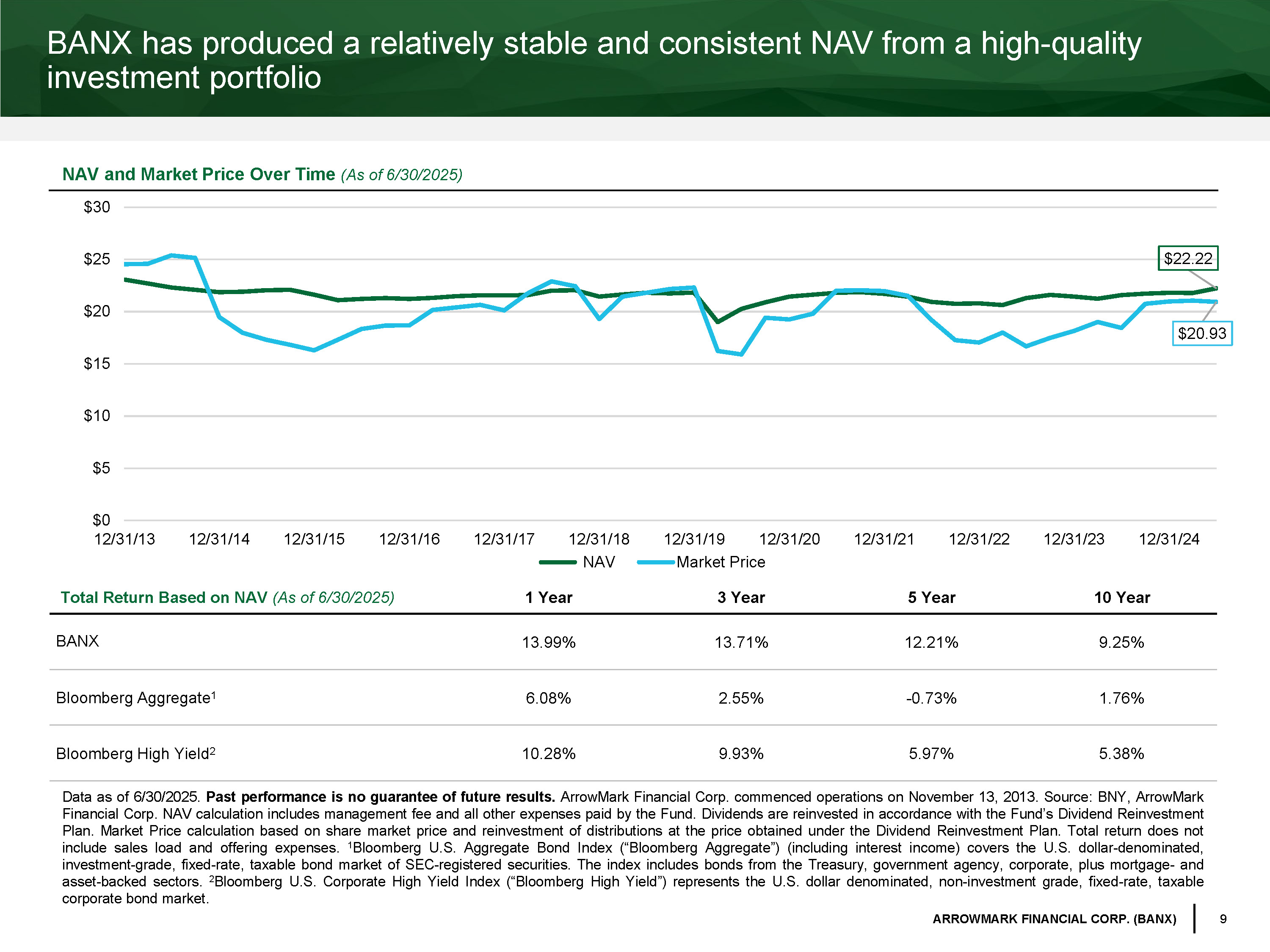 9 ARROWMARK FINANCIAL CORP. (BANX) BANX has produced a relatively stable and consistent NAV from a high - quality investment portfolio NAV and Market Price Over Time (As of 6/30/2025) Total Return Based on NAV (As of 6/30/2025) 1 Year 3 Year 5 Year 10 Year BANX 13.99% 13.71% 12.21% 9.25% Bloomberg Aggregate 1 6.08% 2.55% - 0.73% 1.76% Bloomberg High Yield 2 10.28% 9.93% 5.97% 5.38% Data as of 6 / 30 / 2025 . Past performance is no guarantee of future results . ArrowMark Financial Corp . commenced operations on November 13 , 2013 . Source : BNY, ArrowMark Financial Corp . NAV calculation includes management fee and all other expenses paid by the Fund . Dividends are reinvested in accordance with the Fund’s Dividend Reinvestment Plan . Market Price calculation based on share market price and reinvestment of distributions at the price obtained under the Dividend Reinvestment Plan . Total return does not include sales load and offering expenses . 1 Bloomberg U . S . Aggregate Bond Index (“Bloomberg Aggregate”) (including interest income) covers the U . S . dollar - denominated, investment - grade, fixed - rate, taxable bond market of SEC - registered securities . The index includes bonds from the Treasury, government agency, corporate, plus mortgage - and asset - backed sectors . 2 Bloomberg U . S . Corporate High Yield Index (“Bloomberg High Yield”) represents the U . S . dollar denominated, non - investment grade, fixed - rate, taxable corporate bond market . $22.22 $20.93 $0 $5 $10 $15 $20 $25 $30 12/31/13 12/31/14 12/31/15 12/31/16 12/31/17 12/31/18 12/31/19 12/31/20 12/31/21 12/31/22 12/31/23 12/31/24 NAV Market Price