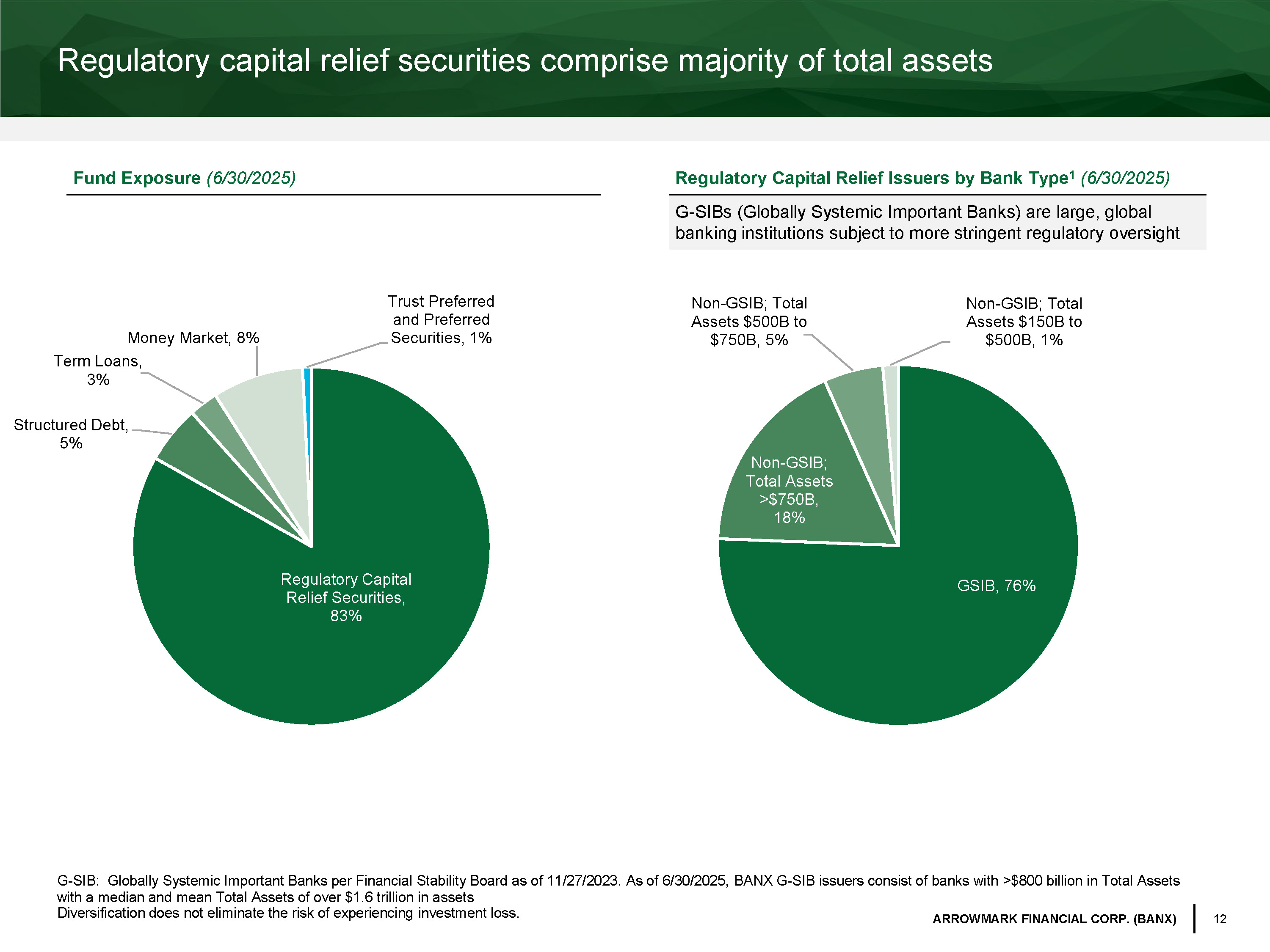12 ARROWMARK FINANCIAL CORP. (BANX) GSIB , 76% Non - GSIB; Total Assets >$750B , 18% Non - GSIB; Total Assets $500B to $750B , 5% Non - GSIB; Total Assets $150B to $500B , 1% Fund Exposure (6/30/2025) Regulatory capital relief securities comprise majority of total assets Diversification does not eliminate the risk of experiencing investment loss. Regulatory Capital Relief Issuers by Bank Type 1 (6/30/2025) G - SIBs (Globally Systemic Important Banks) are large, global banking institutions subject to more stringent regulatory oversight G - SIB: Globally Systemic Important Banks per Financial Stability Board as of 11/27/2023. As of 6/30/2025, BANX G - SIB issuers consist of banks with >$800 billion in Total Assets with a median and mean Total Assets of over $1.6 trillion in assets Regulatory Capital Relief Securities , 83% Structured Debt , 5% Term Loans , 3% Money Market , 8% Trust Preferred and Preferred Securities , 1%