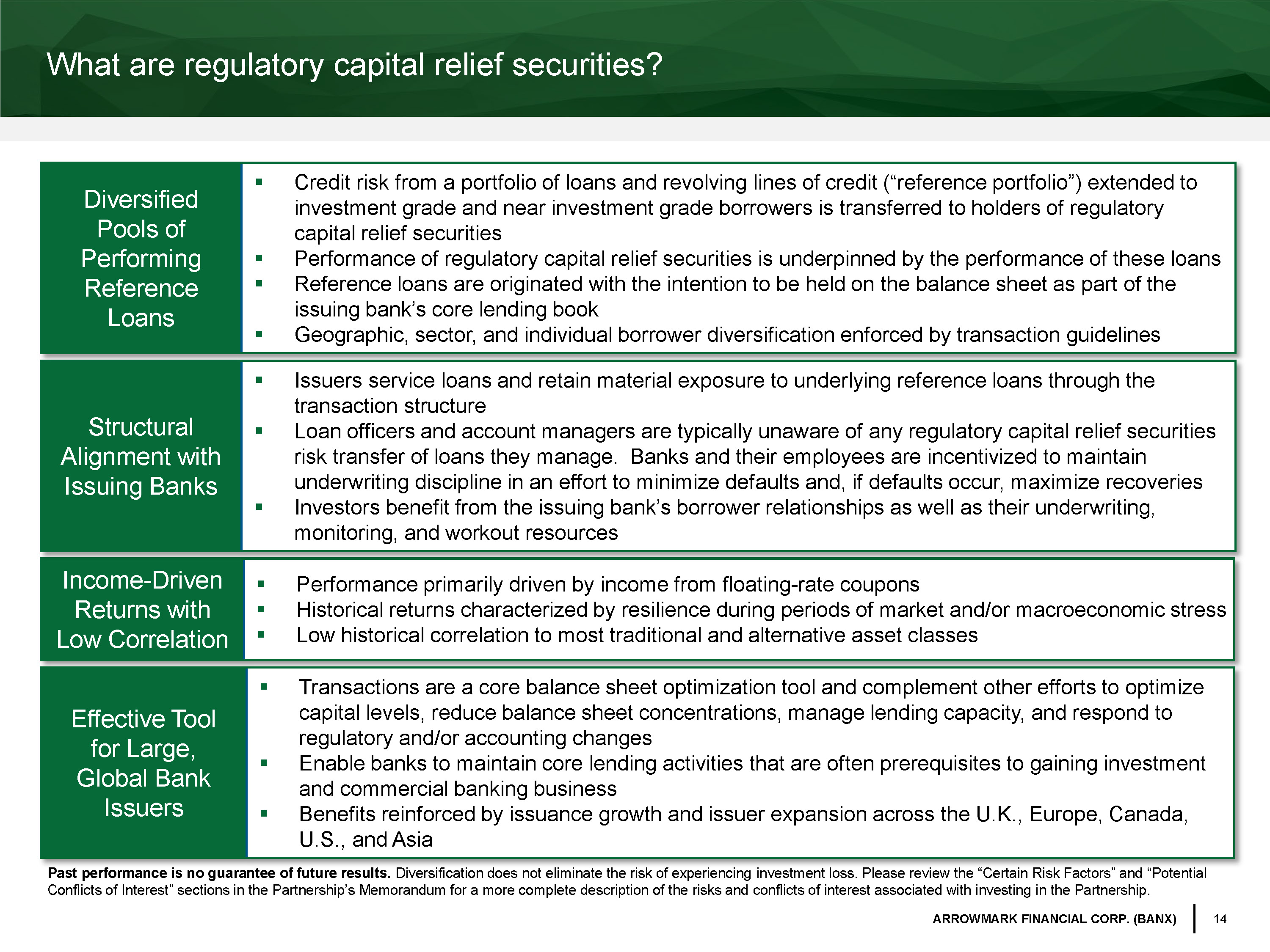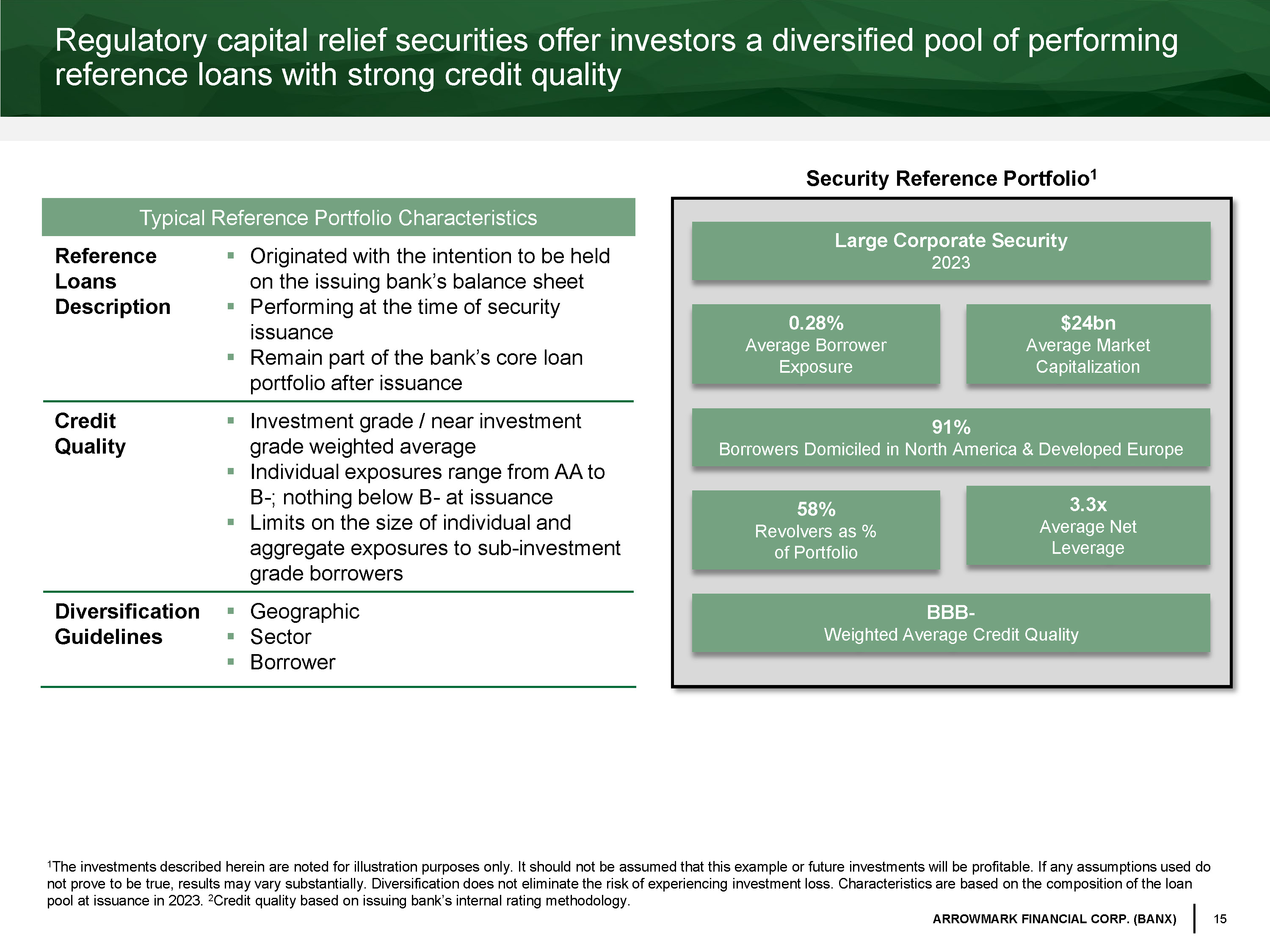 14 ARROWMARK FINANCIAL CORP. (BANX) Past performance is no guarantee of future results. Diversification does not eliminate the risk of experiencing investment loss. Please review the “Certain Risk Factors” and “Po ten tial Conflicts of Interest” sections in the Partnership’s Memorandum for a more complete description of the risks and conflicts of in terest associated with investing in the Partnership. Income - Driven Returns with Low Correlation ▪ Performance primarily driven by income from f loating - rate coupons ▪ Historical returns characterized by resilience during periods of market and/or macroeconomic stress ▪ Low historical correlation to most traditional and alternative asset classes Diversified Pools of P erforming Reference Loans ▪ Credit risk from a portfolio of loans and revolving lines of credit (“reference portfolio”) extended to investment grade and near investment grade borrowers is transferred to holders of regulatory capital relief securities ▪ Performance of regulatory capital relief securities is underpinned by the performance of these loans ▪ Reference loans are originated with the intention to be held on the balance sheet as part of the issuing bank’s core lending book ▪ Geographic, sector, and individual borrower diversification enforced by transaction guidelines Structural Alignment with Issuing Banks ▪ Issuers service loans and retain material exposure to underlying reference loans through the transaction structure ▪ Loan officers and account managers are typically unaware of any regulatory capital relief securities risk transfer of loans they manage. Banks and their employees are incentivized to maintain underwriting discipline in an effort to minimize defaults and, if defaults occur, maximize recoveries ▪ Investors benefit from the issuing bank’s borrower relationships as well as their underwriting, monitoring, and workout resources Effective Tool for Large, Global Bank Issuers ▪ Transactions are a core balance sheet optimization tool and complement other efforts to optimize capital levels, reduce balance sheet concentrations, manage lending capacity, and respond to regulatory and/or accounting changes ▪ Enable banks to maintain core lending activities that are often prerequisites to gaining investment and commercial banking business ▪ Benefits reinforced by issuance growth and issuer expansion across the U.K., Europe, Canada, U.S., and Asia What are regulatory capital relief securities?