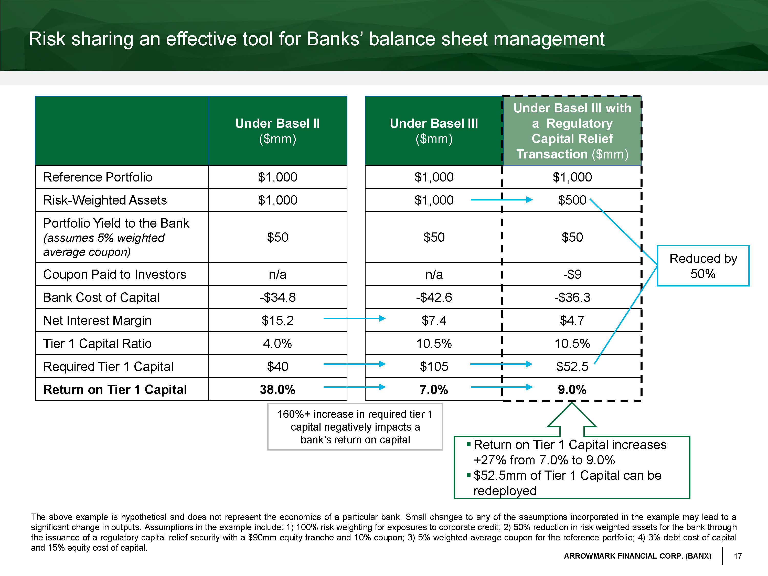 17 ARROWMARK FINANCIAL CORP. (BANX) Under Basel II ($mm) Under Basel III ($mm) Under Basel III with a Regulatory Capital Relief Transaction ($mm) Reference Portfolio $1,000 $1,000 $1,000 Risk - Weighted Assets $1,000 $1,000 $500 Portfolio Yield to the Bank (assumes 5% weighted average coupon) $50 $50 $50 Coupon Paid to Investors n/a n/a - $9 Bank Cost of Capital - $34.8 - $42.6 - $36.3 Net Interest Margin $15.2 $7.4 $4.7 Tier 1 Capital Ratio 4.0% 10.5% 10.5% Required Tier 1 Capital $40 $105 $52.5 Return on Tier 1 Capital 38.0% 7.0% 9.0% Risk sharing an effective tool for Banks’ balance sheet management Reduced by 50% 160%+ increase in required tier 1 capital negatively impacts a bank’s return on capital ▪ Return on Tier 1 Capital increases +27% from 7.0% to 9.0% ▪ $52.5mm of Tier 1 Capital can be redeployed The above example is hypothetical and does not represent the economics of a particular bank . Small changes to any of the assumptions incorporated in the example may lead to a significant change in outputs . Assumptions in the example include : 1 ) 100 % risk weighting for exposures to corporate credit ; 2 ) 50 % reduction in risk weighted assets for the bank through the issuance of a regulatory capital relief security with a $ 90 mm equity tranche and 10 % coupon ; 3 ) 5 % weighted average coupon for the reference portfolio ; 4 ) 3 % debt cost of capital and 15 % equity cost of capital .