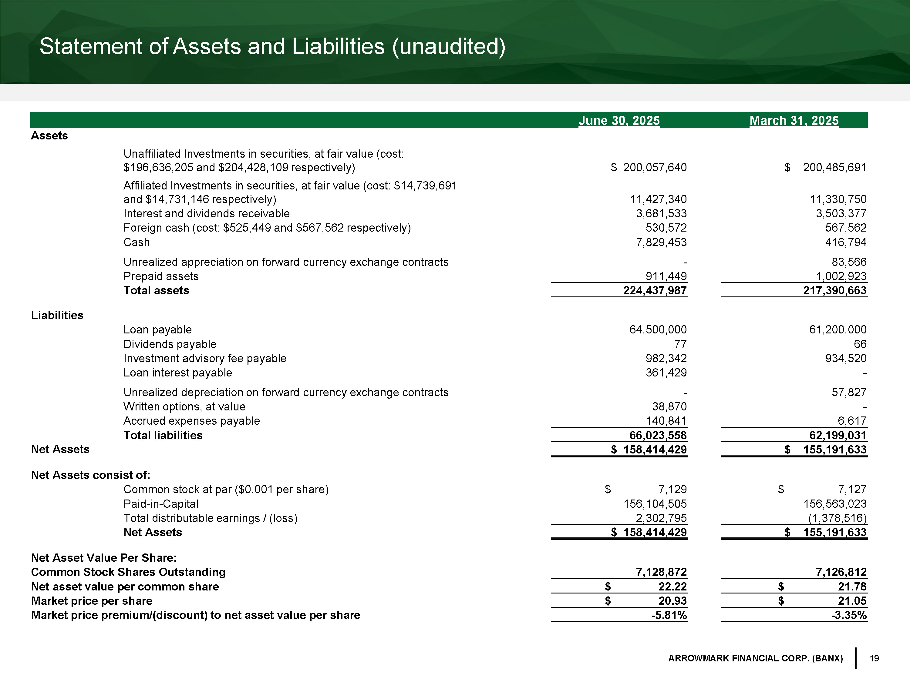 19 ARROWMARK FINANCIAL CORP. (BANX) Statement of Assets and Liabilities (unaudited) June 30, 2025 March 31, 2025 Assets Unaffiliated Investments in securities, at fair value (cost: $196,636,205 and $204,428,109 respectively) $ 200,057,640 $ 200,485,691 Affiliated Investments in securities, at fair value (cost: $14,739,691 and $14,731,146 respectively) 11,427,340 11,330,750 Interest and dividends receivable 3,681,533 3,503,377 Foreign cash (cost: $525,449 and $567,562 respectively) 530,572 567,562 Cash 7,829,453 416,794 Unrealized appreciation on forward currency exchange contracts - 83,566 Prepaid assets 911,449 1,002,923 Total assets 224,437,987 217,390,663 Liabilities Loan payable 64,500,000 61,200,000 Dividends payable 77 66 Investment advisory fee payable 982,342 934,520 Loan interest payable 361,429 - Unrealized depreciation on forward currency exchange contracts - 57,827 Written options, at value 38,870 - Accrued expenses payable 140,841 6,617 Total liabilities 66,023,558 62,199,031 Net Assets $ 158,414,429 $ 155,191,633 Net Assets consist of: Common stock at par ($0.001 per share) $ 7,129 $ 7,127 Paid - in - Capital 156,104,505 156,563,023 Total distributable earnings / (loss) 2,302,795 (1,378,516) Net Assets $ 158,414,429 $ 155,191,633 Net Asset Value Per Share: Common Stock Shares Outstanding 7,128,872 7,126,812 Net asset value per common share $ 22.22 $ 21.78 Market price per share $ 20.93 $ 21.05 Market price premium/(discount) to net asset value per share - 5.81% - 3.35%