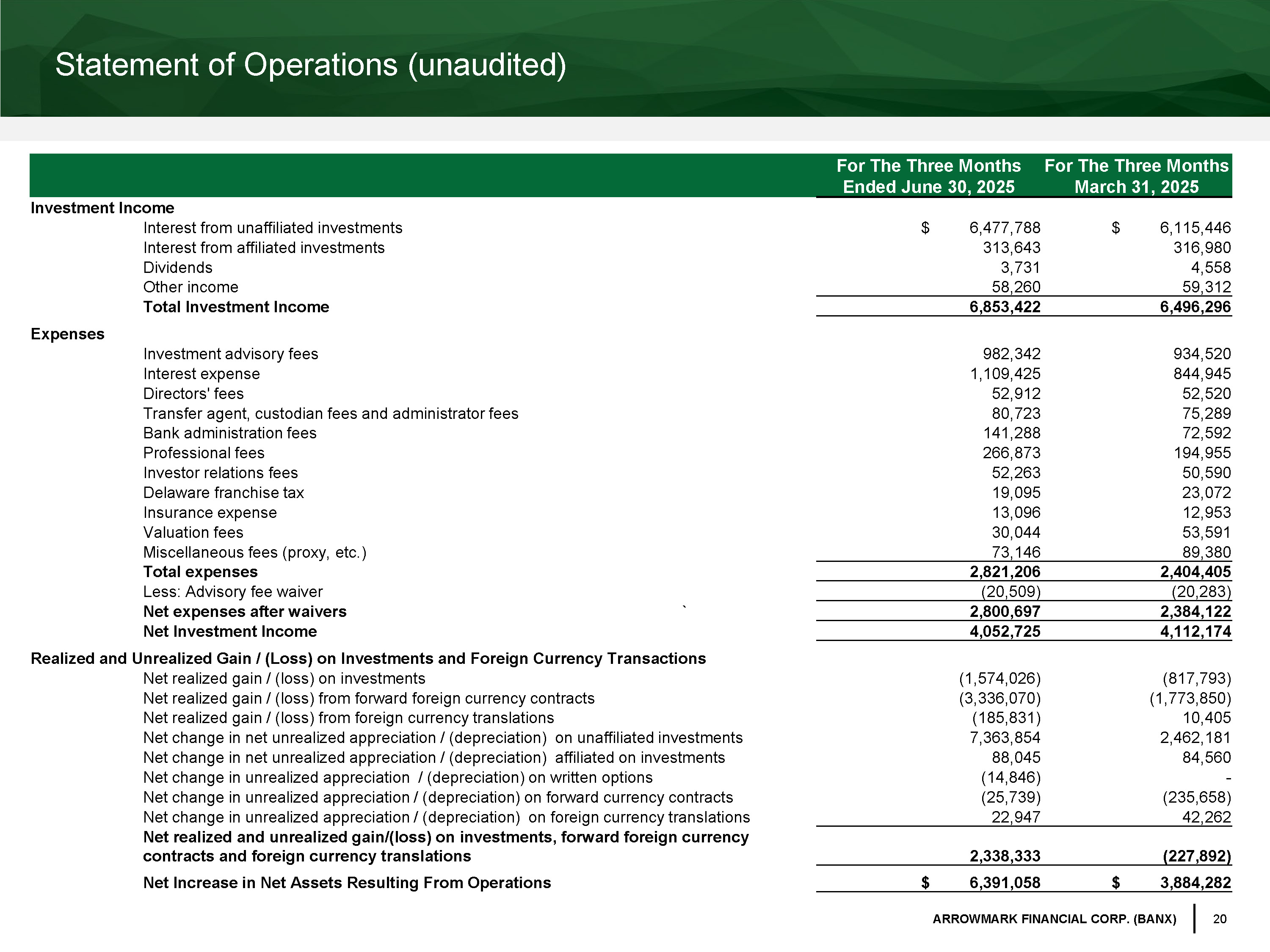 20 ARROWMARK FINANCIAL CORP. (BANX) Statement of Operations (unaudited) For The Three Months Ended June 30, 2025 For The Three Months March 31, 2025 Investment Income Interest from unaffiliated investments $ 6,477,788 $ 6,115,446 Interest from affiliated investments 313,643 316,980 Dividends 3,731 4,558 Other income 58,260 59,312 Total Investment Income 6,853,422 6,496,296 Expenses Investment advisory fees 982,342 934,520 Interest expense 1,109,425 844,945 Directors' fees 52,912 52,520 Transfer agent, custodian fees and administrator fees 80,723 75,289 Bank administration fees 141,288 72,592 Professional fees 266,873 194,955 Investor relations fees 52,263 50,590 Delaware franchise tax 19,095 23,072 Insurance expense 13,096 12,953 Valuation fees 30,044 53,591 Miscellaneous fees (proxy, etc.) 73,146 89,380 Total expenses 2,821,206 2,404,405 Less: Advisory fee waiver (20,509) (20,283) Net expenses after waivers ` 2,800,697 2,384,122 Net Investment Income 4,052,725 4,112,174 Realized and Unrealized Gain / (Loss) on Investments and Foreign Currency Transactions Net realized gain / (loss) on investments (1,574,026) (817,793) Net realized gain / (loss) from forward foreign currency contracts (3,336,070) (1,773,850) Net realized gain / (loss) from foreign currency translations (185,831) 10,405 Net change in net unrealized appreciation / (depreciation) on unaffiliated investments 7,363,854 2,462,181 Net change in net unrealized appreciation / (depreciation) affiliated on investments 88,045 84,560 Net change in unrealized appreciation / (depreciation) on written options (14,846) - Net change in unrealized appreciation / (depreciation) on forward currency contracts (25,739) (235,658) Net change in unrealized appreciation / (depreciation) on foreign currency translations 22,947 42,262 Net realized and unrealized gain/(loss) on investments, forward foreign currency contracts and foreign currency translations 2,338,333 (227,892) Net Increase in Net Assets Resulting From Operations $ 6,391,058 $ 3,884,282