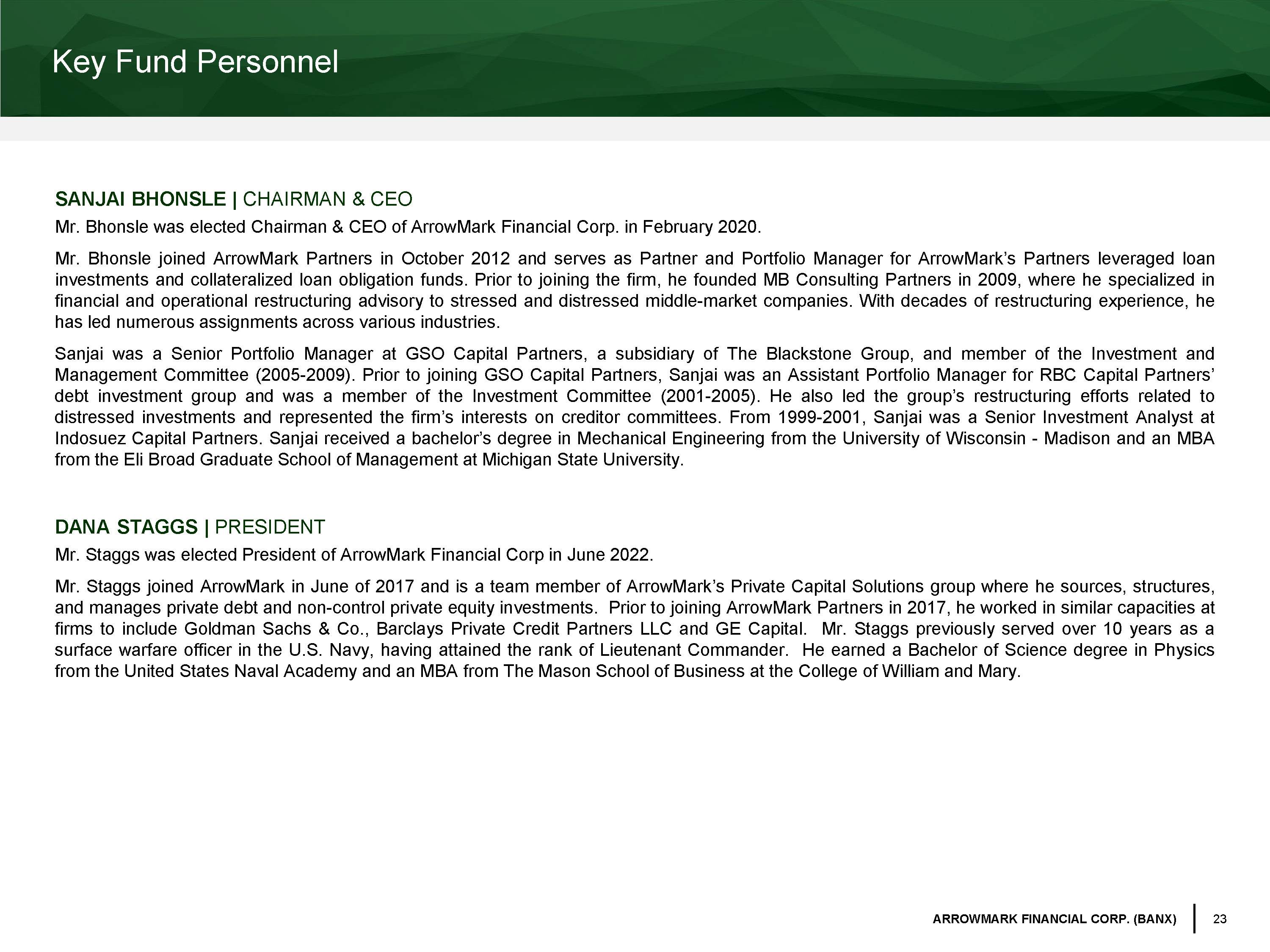 23 ARROWMARK FINANCIAL CORP. (BANX) Key Fund Personnel SANJAI BHONSLE | CHAIRMAN & CEO Mr . Bhonsle was elected Chairman & CEO of ArrowMark Financial Corp . in February 2020 . Mr . Bhonsle joined ArrowMark Partners in October 2012 and serves as Partner and Portfolio Manager for ArrowMark’s Partners leveraged loan investments and collateralized loan obligation funds . Prior to joining the firm, he founded MB Consulting Partners in 2009 , where he specialized in financial and operational restructuring advisory to stressed and distressed middle - market companies . With decades of restructuring experience, he has led numerous assignments across various industries . Sanjai was a Senior Portfolio Manager at GSO Capital Partners, a subsidiary of The Blackstone Group, and member of the Investment and Management Committee ( 2005 - 2009 ) . Prior to joining GSO Capital Partners, Sanjai was an Assistant Portfolio Manager for RBC Capital Partners’ debt investment group and was a member of the Investment Committee ( 2001 - 2005 ) . He also led the group’s restructuring efforts related to distressed investments and represented the firm’s interests on creditor committees . From 1999 - 2001 , Sanjai was a Senior Investment Analyst at Indosuez Capital Partners . Sanjai received a bachelor’s degree in Mechanical Engineering from the University of Wisconsin - Madison and an MBA from the Eli Broad Graduate School of Management at Michigan State University . DANA STAGGS | PRESIDENT Mr . Staggs was elected President of ArrowMark Financial Corp in June 2022 . Mr . Staggs joined ArrowMark in June of 2017 and is a team member of ArrowMark’s Private Capital Solutions group where he sources, structures, and manages private debt and non - control private equity investments . Prior to joining ArrowMark Partners in 2017 , he worked in similar capacities at firms to include Goldman Sachs & Co . , Barclays Private Credit Partners LLC and GE Capital . Mr . Staggs previously served over 10 years as a surface warfare officer in the U . S . Navy, having attained the rank of Lieutenant Commander . He earned a Bachelor of Science degree in Physics from the United States Naval Academy and an MBA from The Mason School of Business at the College of William and Mary .
