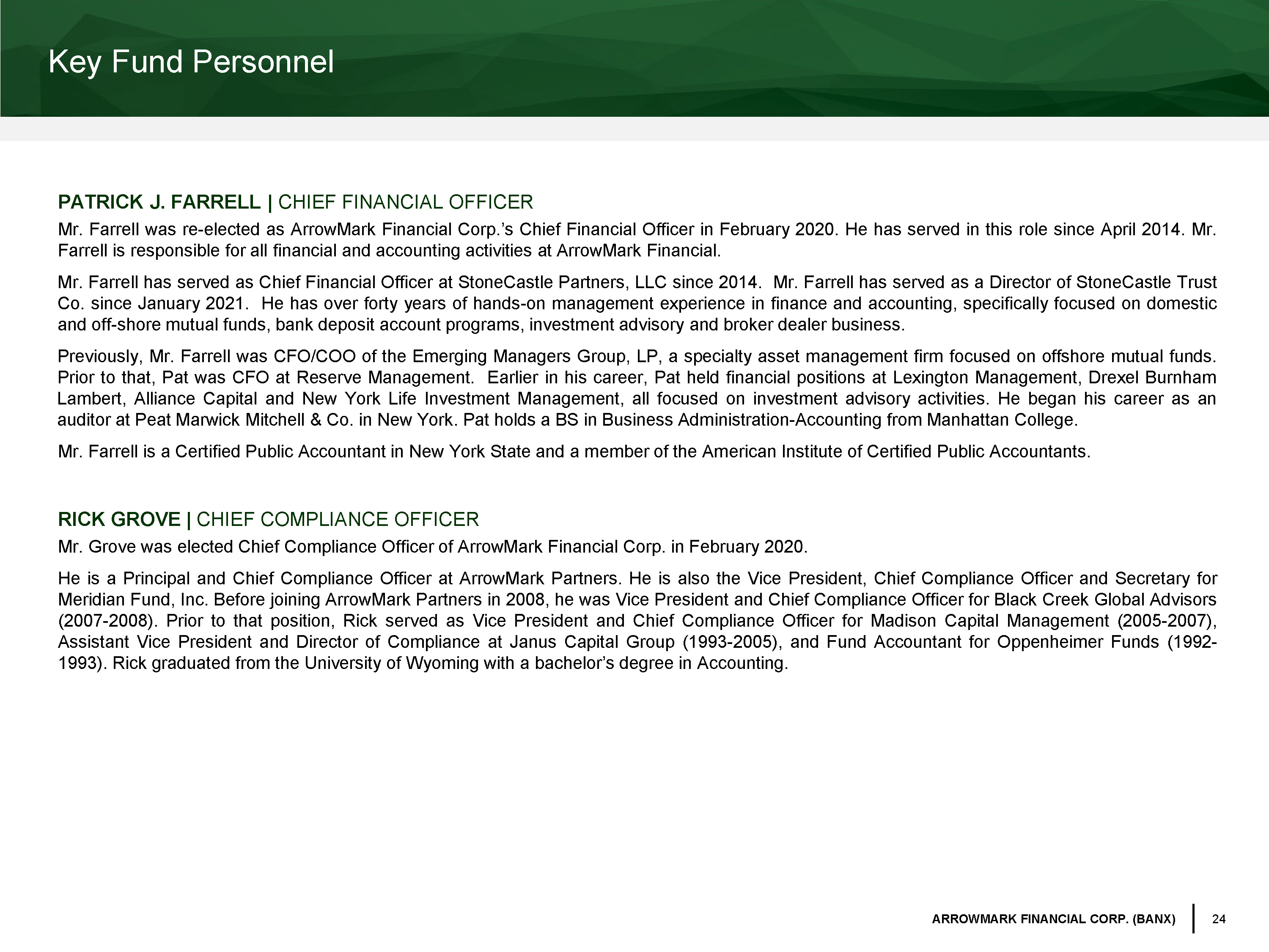 24 ARROWMARK FINANCIAL CORP. (BANX) Key Fund Personnel PATRICK J . FARRELL | CHIEF FINANCIAL OFFICER Mr . Farrell was re - elected as ArrowMark Financial Corp . ’s Chief Financial Officer in February 2020 . He has served in this role since April 2014 . Mr . Farrell is responsible for all financial and accounting activities at ArrowMark Financial . Mr . Farrell has served as Chief Financial Officer at StoneCastle Partners, LLC since 2014 . Mr . Farrell has served as a Director of StoneCastle Trust Co . since January 2021 . He has over forty years of hands - on management experience in finance and accounting, specifically focused on domestic and off - shore mutual funds, bank deposit account programs, investment advisory and broker dealer business . Previously, Mr . Farrell was CFO/COO of the Emerging Managers Group, LP, a specialty asset management firm focused on offshore mutual funds . Prior to that, Pat was CFO at Reserve Management . Earlier in his career, Pat held financial positions at Lexington Management, Drexel Burnham Lambert, Alliance Capital and New York Life Investment Management, all focused on investment advisory activities . He began his career as an auditor at Peat Marwick Mitchell & Co . in New York . Pat holds a BS in Business Administration - Accounting from Manhattan College . Mr . Farrell is a Certified Public Accountant in New York State and a member of the American Institute of Certified Public Accountants . RICK GROVE | CHIEF COMPLIANCE OFFICER Mr . Grove was elected Chief Compliance Officer of ArrowMark Financial Corp . in February 2020 . He is a Principal and Chief Compliance Officer at ArrowMark Partners . He is also the Vice President, Chief Compliance Officer and Secretary for Meridian Fund, Inc . Before joining ArrowMark Partners in 2008 , he was Vice President and Chief Compliance Officer for Black Creek Global Advisors ( 2007 - 2008 ) . Prior to that position, Rick served as Vice President and Chief Compliance Officer for Madison Capital Management ( 2005 - 2007 ), Assistant Vice President and Director of Compliance at Janus Capital Group ( 1993 - 2005 ), and Fund Accountant for Oppenheimer Funds ( 1992 - 1993 ) . Rick graduated from the University of Wyoming with a bachelor’s degree in Accounting .