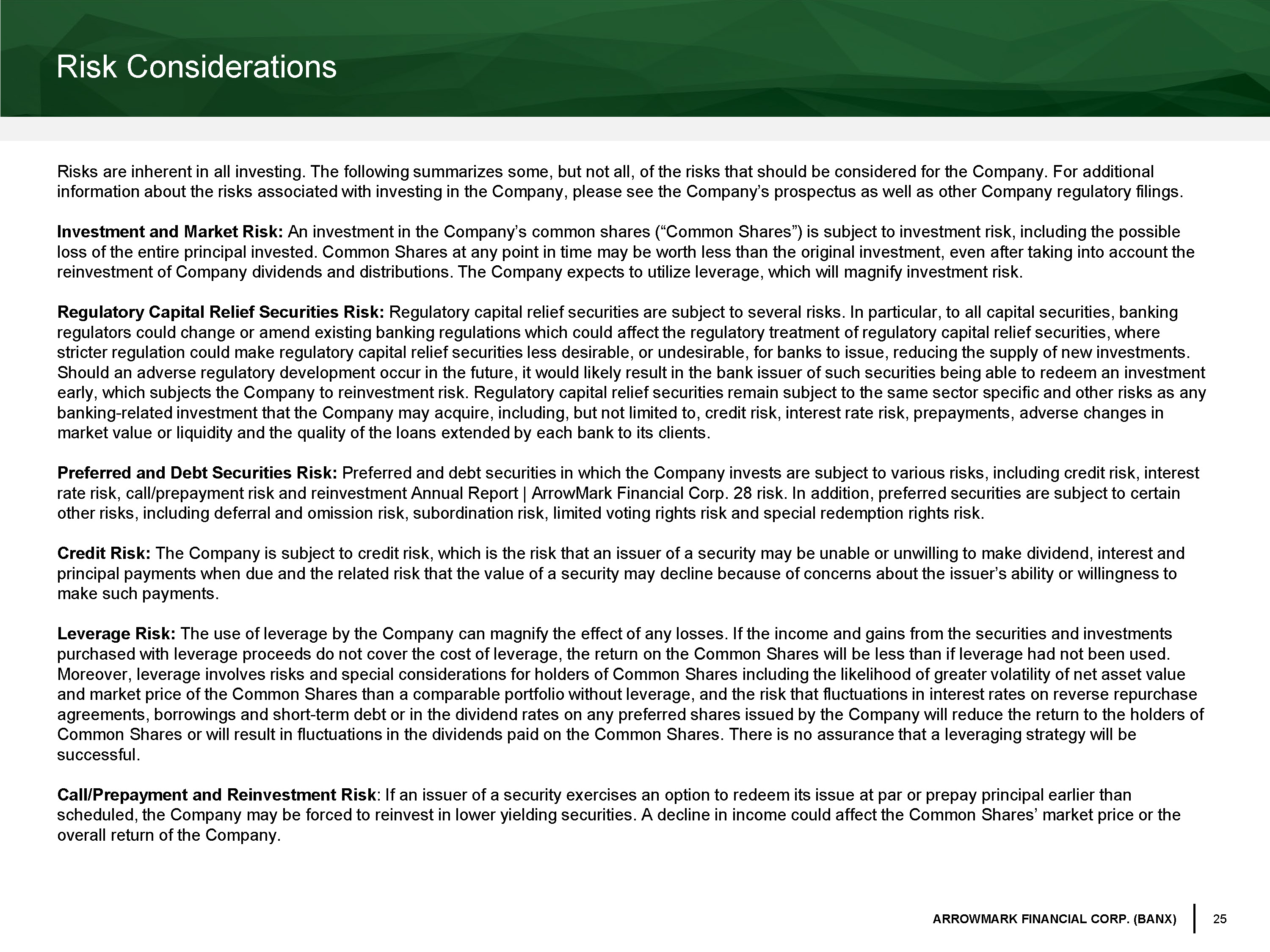25 ARROWMARK FINANCIAL CORP. (BANX) Risk Considerations Risks are inherent in all investing. The following summarizes some, but not all, of the risks that should be considered for t he Company. For additional information about the risks associated with investing in the Company, please see the Company’s prospectus as well as other Co mpa ny regulatory filings. Investment and Market Risk: An investment in the Company’s common shares (“Common Shares”) is subject to investment risk, including the possible loss of the entire principal invested. Common Shares at any point in time may be worth less than the original investment, eve n a fter taking into account the reinvestment of Company dividends and distributions. The Company expects to utilize leverage, which will magnify investment r isk . Regulatory Capital Relief Securities Risk: Regulatory capital relief securities are subject to several risks. In particular, to all capital securities, banking regulators could change or amend existing banking regulations which could affect the regulatory treatment of regulatory capit al relief securities, where stricter regulation could make regulatory capital relief securities less desirable, or undesirable, for banks to issue, reduc ing the supply of new investments. Should an adverse regulatory development occur in the future, it would likely result in the bank issuer of such securities be ing able to redeem an investment early, which subjects the Company to reinvestment risk. Regulatory capital relief securities remain subject to the same secto r s pecific and other risks as any banking - related investment that the Company may acquire, including, but not limited to, credit risk, interest rate risk, prepaym ents, adverse changes in market value or liquidity and the quality of the loans extended by each bank to its clients. Preferred and Debt Securities Risk: Preferred and debt securities in which the Company invests are subject to various risks, including credit risk, interest rate risk, call/prepayment risk and reinvestment Annual Report | ArrowMark Financial Corp. 28 risk. In addition, preferred se cur ities are subject to certain other risks, including deferral and omission risk, subordination risk, limited voting rights risk and special redemption righ ts risk. Credit Risk: The Company is subject to credit risk, which is the risk that an issuer of a security may be unable or unwilling to make divi de nd, interest and principal payments when due and the related risk that the value of a security may decline because of concerns about the issue r’s ability or willingness to make such payments. Leverage Risk: The use of leverage by the Company can magnify the effect of any losses. If the income and gains from the securities and inve stm ents purchased with leverage proceeds do not cover the cost of leverage, the return on the Common Shares will be less than if leve rag e had not been used. Moreover, leverage involves risks and special considerations for holders of Common Shares including the likelihood of greater vo latility of net asset value and market price of the Common Shares than a comparable portfolio without leverage, and the risk that fluctuations in interes t r ates on reverse repurchase agreements, borrowings and short - term debt or in the dividend rates on any preferred shares issued by the Company will reduce th e return to the holders of Common Shares or will result in fluctuations in the dividends paid on the Common Shares. There is no assurance that a leverag ing strategy will be successful. Call/Prepayment and Reinvestment Risk : If an issuer of a security exercises an option to redeem its issue at par or prepay principal earlier than scheduled, the Company may be forced to reinvest in lower yielding securities. A decline in income could affect the Common Sh are s’ market price or the overall return of the Company.